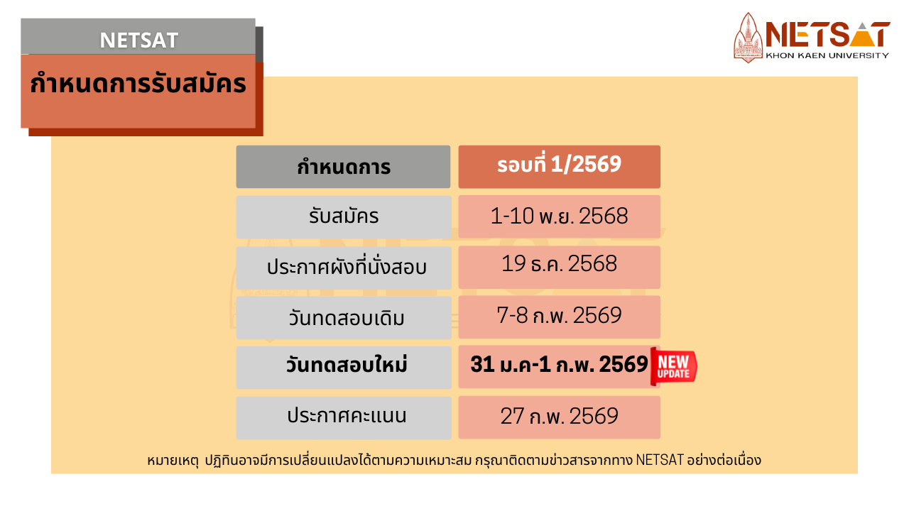 กำหนดการรับสมัคร การทดสอบ NETSAT มีจำนวน 2 รอบ/ปี ดังนี้รอบที่ 1 รับสมัครช่วงเดือนพฤศจิกายน และสอบช่วงเดือนกุมภาพันธ์รอบที่ 2 รับสมัครช่วงเดือนมิถุนายน และสอบช่วงเดือนสิงหาคม